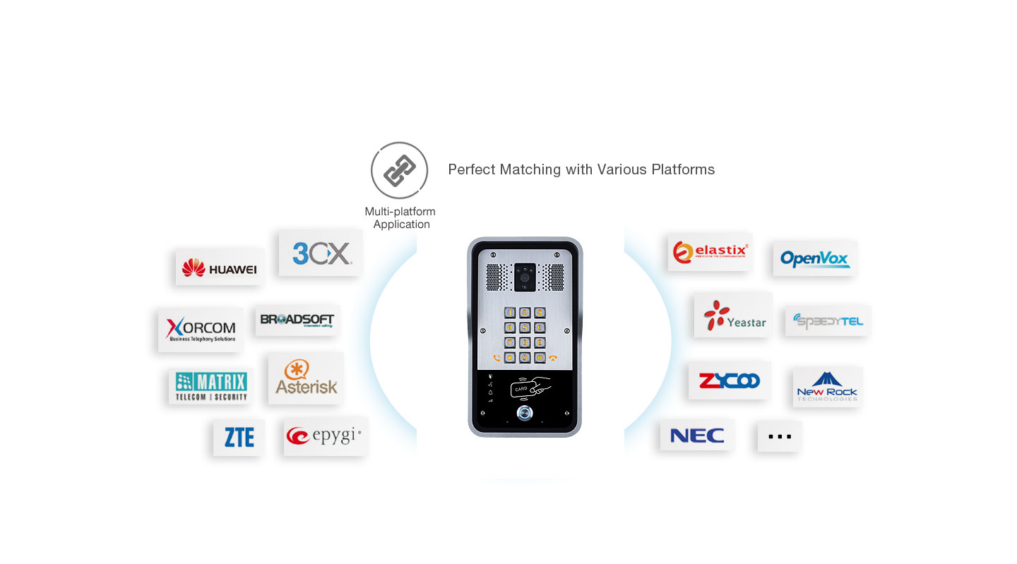 • Voice/video Intercom• Speed Dial(speed dial key)• Auto-Answering (per line)• Voice Message (on server)• Barge in and calls switched automatically• Local 3-way Conference• Hotline Phone Features• High Quality video calls• Support SIP 2.0 and related RFCs• Call log (dialed/incoming/missed)• Open Door Logs• Support RFID Card issues (1999 entries)• Programmable DSS keys• Network Time Synchronization• Action URL / Active URI Audio• Wideband CODEC: G.722• Narrowband CODEC: G.711a/u, G.723.1, G.726-32K, G.729AB, iLBC, AMR• Full-duplex Acoustic Echo Canceller (AEC) – Hands- free Mode, 128ms tail-length•Voice Activity Detection (VAD) / Comfort Noise Generation (CNG) / Background Noise Estimation (BNE) / Noise Reduction (NR)• Packet Loss Concealment (PLC)• Dynamic Adaptive Jitter Buffer• DTMF: In-band, Out of Band (RFC2833) / SIP INFO• Omnidirectional pickup: pickup distance 5 mVideo